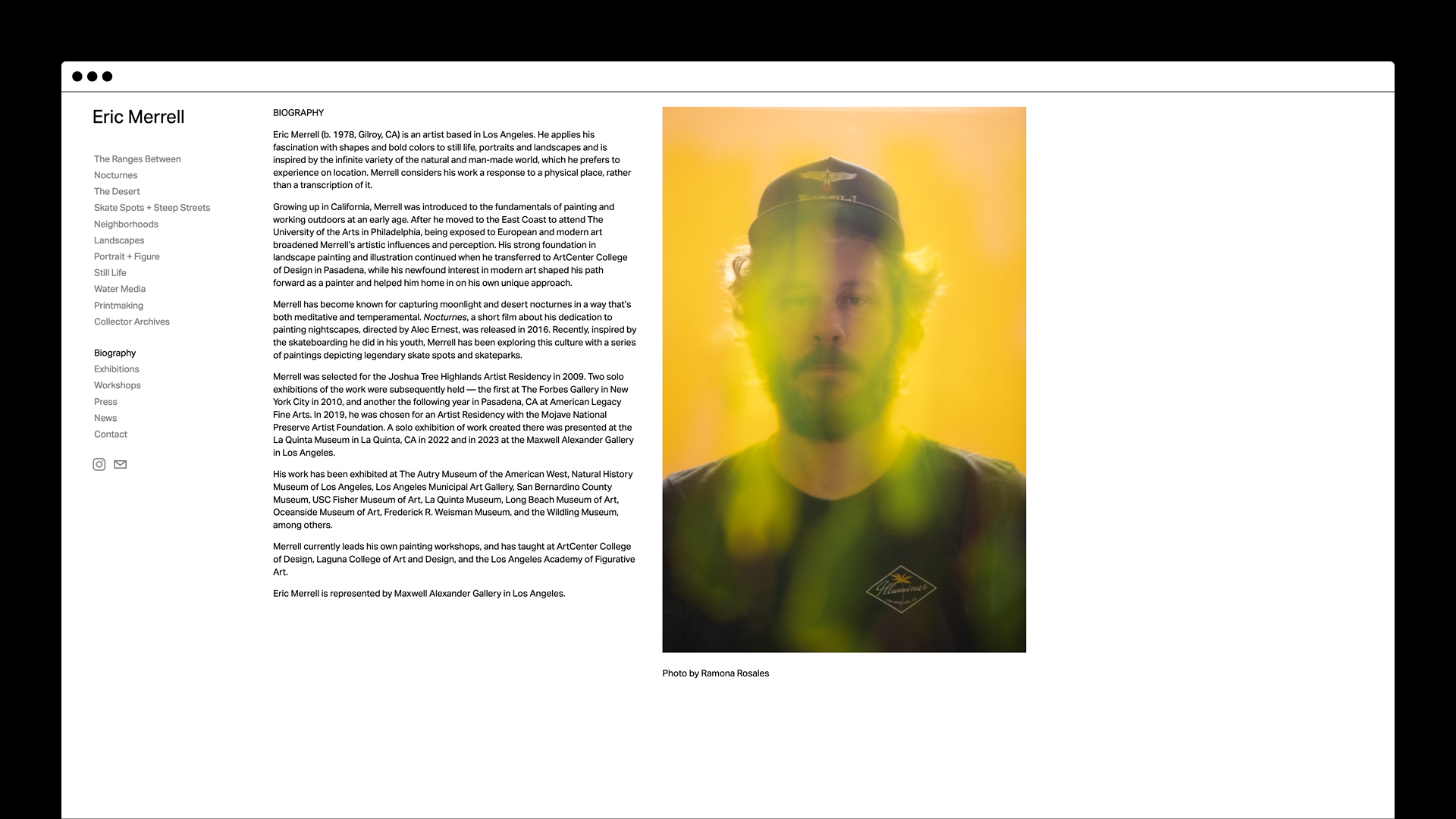 Eric Merrell is an artist based in Los Angeles. He is most known for painting by moonlight in the Southern California deserts. He prefers to experience the variety of our planet’s landscapes in person and considers his work a response to a physical place, rather than a transcription of it. Merrell frequently exhibits his work in shows and is represented by Maxwell Alexander Gallery.